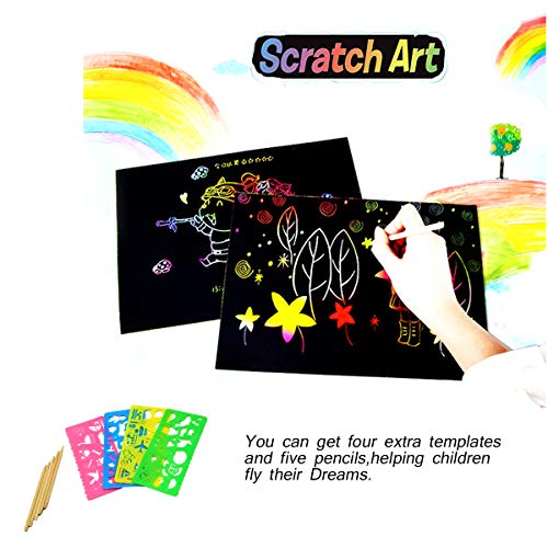 Scratch Art Paper: 50 fogli di carta antigraffio, 5 stilo in legno, 4 righelli da disegno. Ogni carta con un divertente strato olografico color arcobaleno nascosto sotto il rivestimento nero opaco. Quantità sufficiente e accessori per i bambini per disegnare la pratica. Il compagno di viaggio perfetto per ogni bambino e ore di divertimento scolastico.