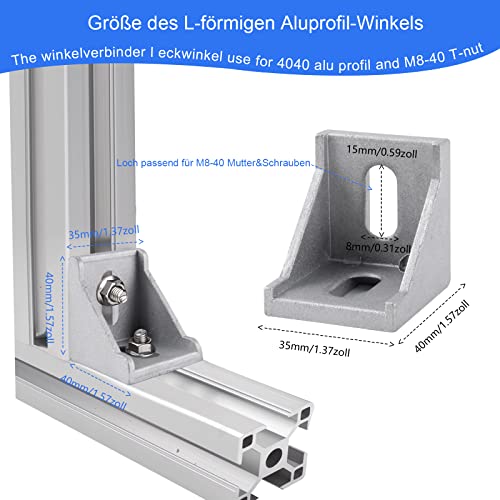 Specifiche dell'angolo di alluminio: il connettore angolare in alluminio a forma di L è adatto per dadi M8 e profilo in alluminio serie 40. Dimensioni del profilo angolare: 40 mm x 35 mm x 40 mm. E il foro è compatibile con viti e dadi M8. Il connettore angolare a 90 gradi in alluminio è adatto per il profilo in alluminio 40 x 40.