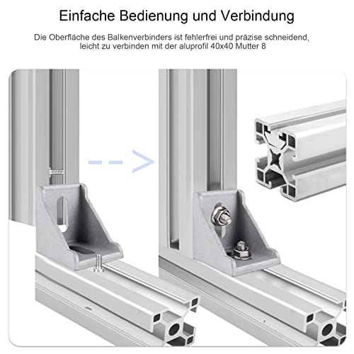 Facile da usare: l'angolo a forma di L può essere utilizzato per il collegamento di profili in alluminio 40 x 40. È molto facile da usare nella costruzione industriale e nella costruzione di strutture in alluminio industriale. Robusto profilo a L in alluminio con punto di arresto per evitare che i dadi si muovano all'infinito. Il connettore angolare a 90 gradi in alluminio è un accessorio di collegamento molto pratico per il collegamento di profili in alluminio.