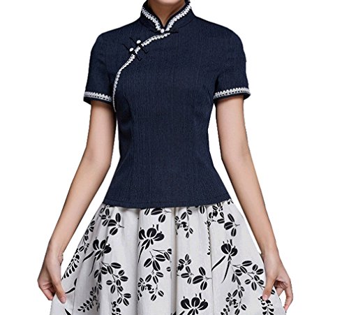 YueLian Cotone Canapa Moda Migliorato Camicetta Cinese Tradizionale Bordo Pizzo Nero(Blu Scuro, China S=IT 38)