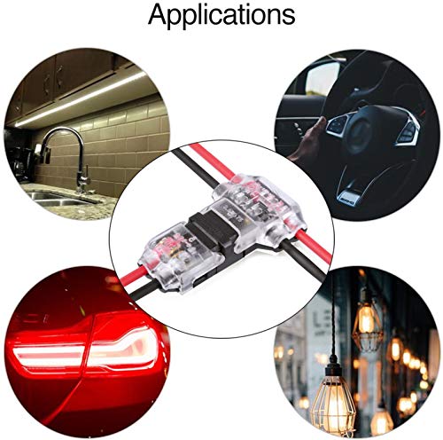 【Ampia applicazione】 Il connettore a filo t (connettore a 2 fili) è sicuro e perfetto nel cablaggio nel campo dell'illuminazione domestica, illuminazione paesaggistica, robotica, automobili, elettrodomestici. Adatto per tutti i veicoli, audio, video, altoparlanti, installazione di luci a strisce LED e altre apparecchiature elettriche.