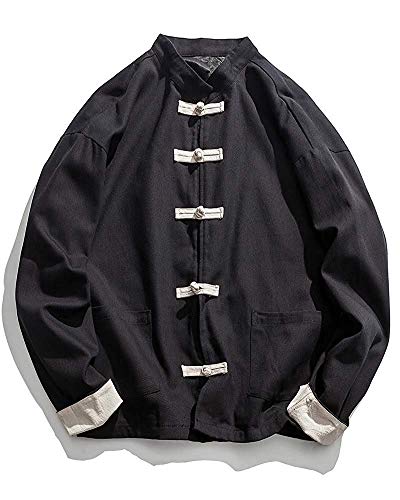 Yueyue Camicia Uomo Cotone Cinese Tradizionale in Lino E Tai Chi Kung Fu con Collo A Rana (Nero, 3XL)