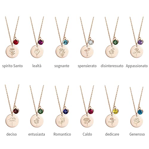 Collana con pietre natali Ogni collana a disco con ciondolo a fiore ha un significato implicito per trasmettere il vostro amore e le vostre benedizioni, mentre la collana con ciondolo in oro ha 12 pietre colorate diverse che corrispondono alla pietra fortunata di ogni mese. Scegliete la vostra pietra portafortuna in base al vostro mese di nascita. Una collana di fiori della natività è il regalo perfetto per portarvi fortuna e felicità;