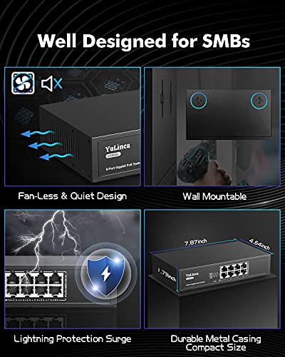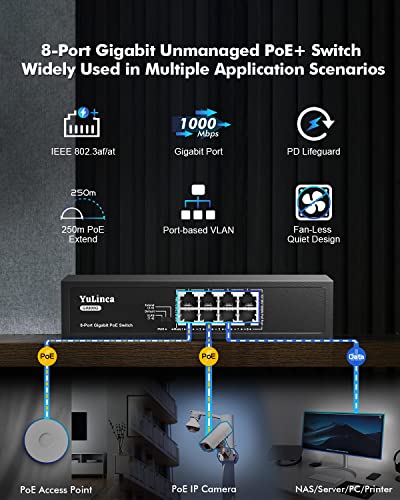 YuLinca Switch Poe Gigabit a 8 Porte, IEEE802.3af/at, Hi-Poe(60W), Max 120W, VLAN basata su Porta, Estensione Poe 250m, PD Lifeguard, Switch Ethernet Non gestito Senza Ventola