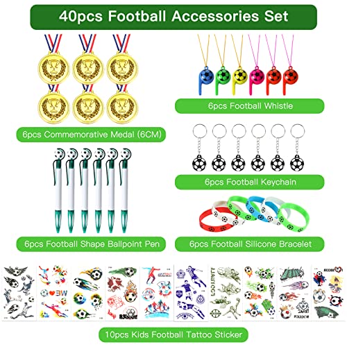 Yumcute 40pcs Calcio Gadget Compleanno Bambini, Includere Calcio Braccialetto in Silicone, Medaglia, Fischietti, Portachiavi, Tatuaggi per Bambini Calcio, Penna Gel, Calcio Festa Regalo Bambini