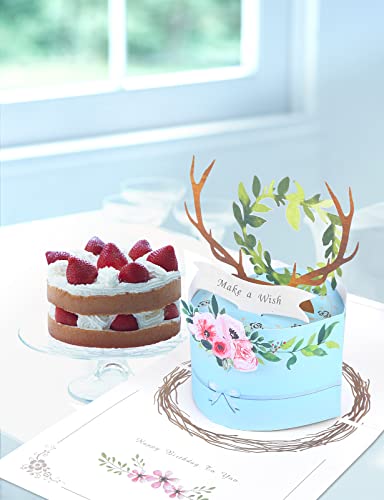 【Design 3D Unico】 Quando il biglietto d'auguri è piegato e piatto, puoi vedere la ghirlanda di foglie e i fiori sulla copertina bianca. Quando la carta viene aperta, lo straordinario motivo 3D si apre e presenta una torta blu con una ghirlanda di foglie e corna su di essa, creando un momento speciale e commovente.