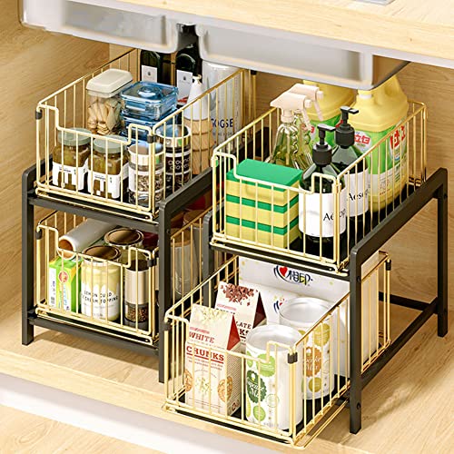 YunNasi Cestelli Scorrevoli Sottolavello 2 Tier Scaffale Portaoggetti con Cestello Scorrevole Organizer Sottolavello Visibile Conservazione Traspirante per Casa, Cucina, Bagno,Ufficio (Oro)