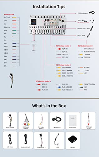 【Contenuto della confezione】 1 x presa di alimentazione / 1 x cavo di uscita RCA A / 1 x cavo di uscita RCA B / 1 x cavo di uscita RCA C / 1 x cavo di uscita RCA D / 1 x antenna GPS / 1 x cavo USB / 1 x doppio cavo USB / 1 x antenna radio / 1 x telecamera posteriore / 1 x microfono esterno / 1 x autoradio / 1 x manuale utente