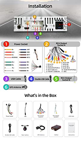 【CONTENU DE LA BOÎTE】 2 x Presa di corrente / 1 x Presa di uscita RCA A / 1 presa di uscita RCA B / 1 x antenna GPS / 2 x cavo USB / 1 x antenna radio / 1 x Canbus / 1 x telecamera per retrovisione / 1 x manuale utente