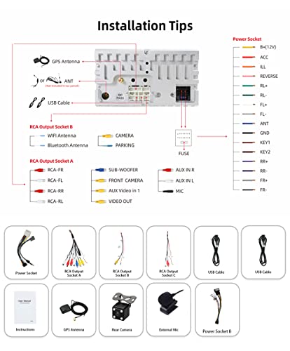 【Contenuto della confezione】 1 x presa di alimentazione / 1 x cavo di uscita RCA A / 1 x cavo di uscita RCA B / 1 x cavo di uscita RCA C / 1 x cavo di uscita RCA D / 1 x antenna GPS / 1 x cavo USB / 1 x doppio cavo USB / 1 x antenna radio / 1 x telecamera posteriore / 1 x microfono esterno / 1 x autoradio / 1 x manuale utente