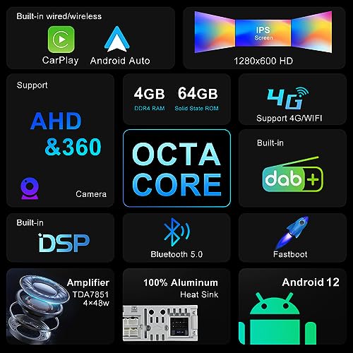 【Sistema stabile e affidabile】 - Sistema Android 12 con CPU a 8 core più avanzata, A53 2,5 GHz, 4GB di RAM + 64GB di ROM, con questa velocità di elaborazione, può rispondere rapidamente alle attività ed elaborare le informazioni in modo più efficiente-Avvio rapido-Bluetooth 5.0 per le mani -chiamate gratuite - Supporta USB e scheda di memoria SD fino a 500 GB, supporta 360 fotocamere (B0B4W5Y4TW) - REGALO GRATUITO: microfono esterno e telecamera per la retromarcia