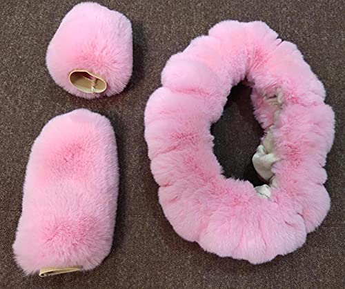 YUNZLAN Coprivolante per Auto in Pelliccia di Coniglio soffice e soffice, Caldo e Confortevole in Inverno coprivolante sfocato + Copri Freno a Mano + Copri Cambio (Pink)