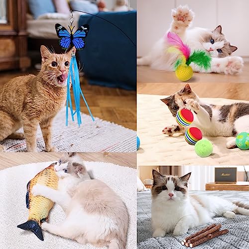 ✨ 【SET DI GIOCATTOLI PER GATTI】 Il nostro set da gioco per gatti da 42 pezzi include un tunnel per gatti,una bacchetta magica per gatti,un bastoncino per gatti con farfalla ventosa,pesce sisal,ricariche di piume e nappe naturali,giocattolo per gatti con pallina tintinnante,pallina color arcobaleno,peluche palla,campana giocattolo,topi colorati,campana e altri giocattoli vari.È un grande regalo per il compleanno del tuo gatto e tutti i giorni .