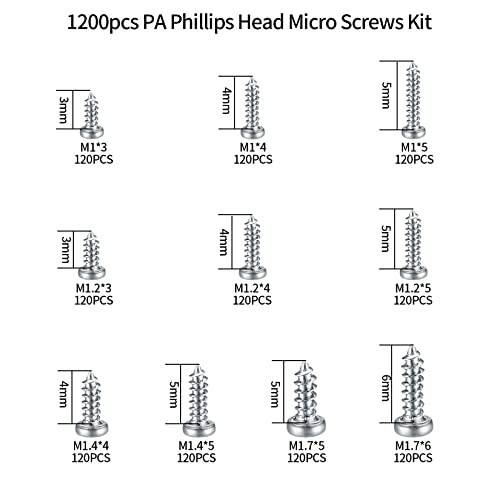 Contenuto della confezione: riceverai 1200 viti piccole in totale, 10 dimensioni, 120 pezzi per ogni dimensione: m1 x 3 mm, m1 x 4 mm, m1 x 5 mm, m1,2 x 3 mm, m1,2 x 4 mm, m1, 2 x 5 mm, m1.4x4mm, m1.4x5mm, m1.7x5mm, m1.7x6mm.