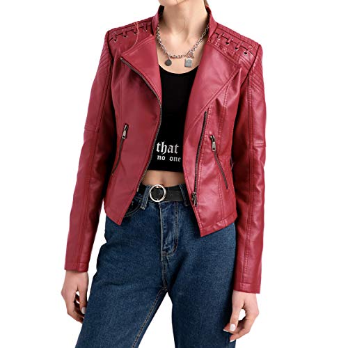 Yynuda, Giacca da motociclista da donna in ecopelle, elegante, con cerniera, classica, corta, Rosso, S