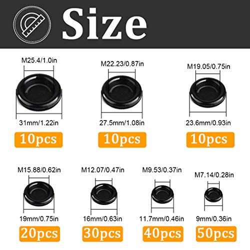 Passacavi da 170 dimensioni 7 pezzi: 50 pezzi x 7,14 mm, 40 pezzi x 9,53 mm, 30 pezzi x 12,07 mm, 20 pezzi x 15,88 mm, 10 pezzi x 19,05 mm, 10 pezzi x 22,23 mm, 10 pezzi x 25,40 mm.