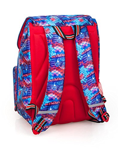 Zaino estensibile The Ultimate Spiderman, dotato di schienale imbottito, spallacci imbottiti e regolabili, maniglia di sollevamento, grafica stampata sul fronte e sui lati, grafica plastificata effetto 3D applicata sulla pattella superiore, tasca inferiore con chiusura a zip dotata di pendete in gomma e parapioggia, tasca superiore con chiusura a zip dotata di pendente in gomma e parapioggia, separatore interno per una più razionale divisione dei libri, chiusura pattella con doppia clip.