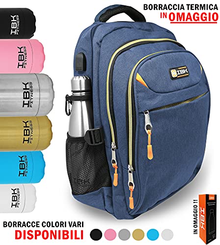 IBK Zaino da viaggio per PC Computer Portatile Laptop Notebook, con borraccia termica inclusa, tessuto impermeabile, 15.6 Pollici, con Caricatore USB, Lavoro Uomo Donna per Scuola