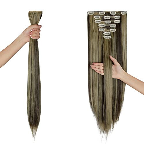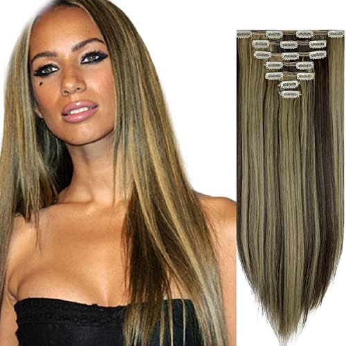 ZAIQUN Extension per capelli con clip, 7 pezzi, 16 clip, 50,5 cm, capelli sintetici lisci, castano scuro, extension per capelli biondi cenere e biondo cenere