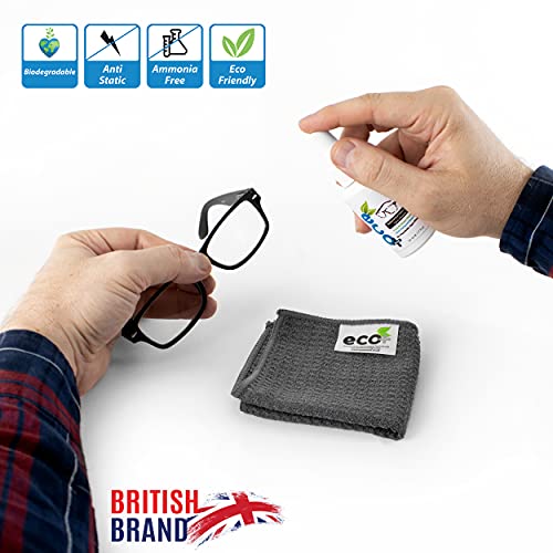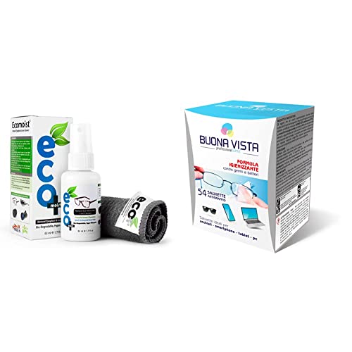 Prodotto 1: CHE COS'È Il detergente per lenti Ecomoist protegge i tuoi occhiali da lettura con questo kit PULIZIA LENTI naturale che rimuoverà delicatamente tutta la polvere, lo sporco, le macchie, il grasso e le impronte digitali. Le tue lenti saranno riportate alla loro condizione brillante originale. Perfetto per lenti rivestite e in policarbonato.