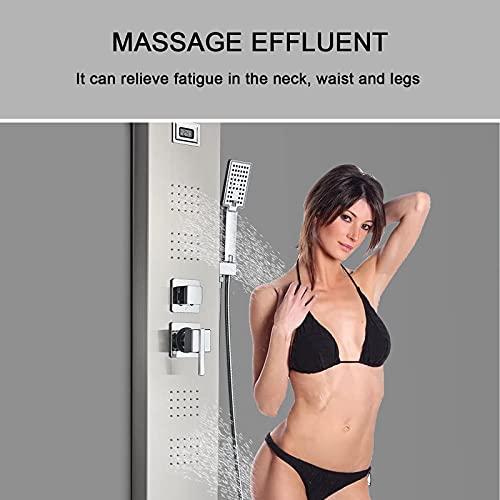 【Colonna doccia idromassaggio】: questa colonna doccia comprende 5 funzioni: effetto cascata, effetto pioggia, getti di massaggio, uscita della vasca, doccetta (3 modalità). può essere facilmente commutato da pulsanti, che vi offre un'esperienza di massaggio e relax sotto la doccia, per eliminare l'affaticamento della giornata. Display LCD visivo in tempo reale della temperatura dell'acqua, più sicuro e più pratico, per garantire la sicurezza della doccia.