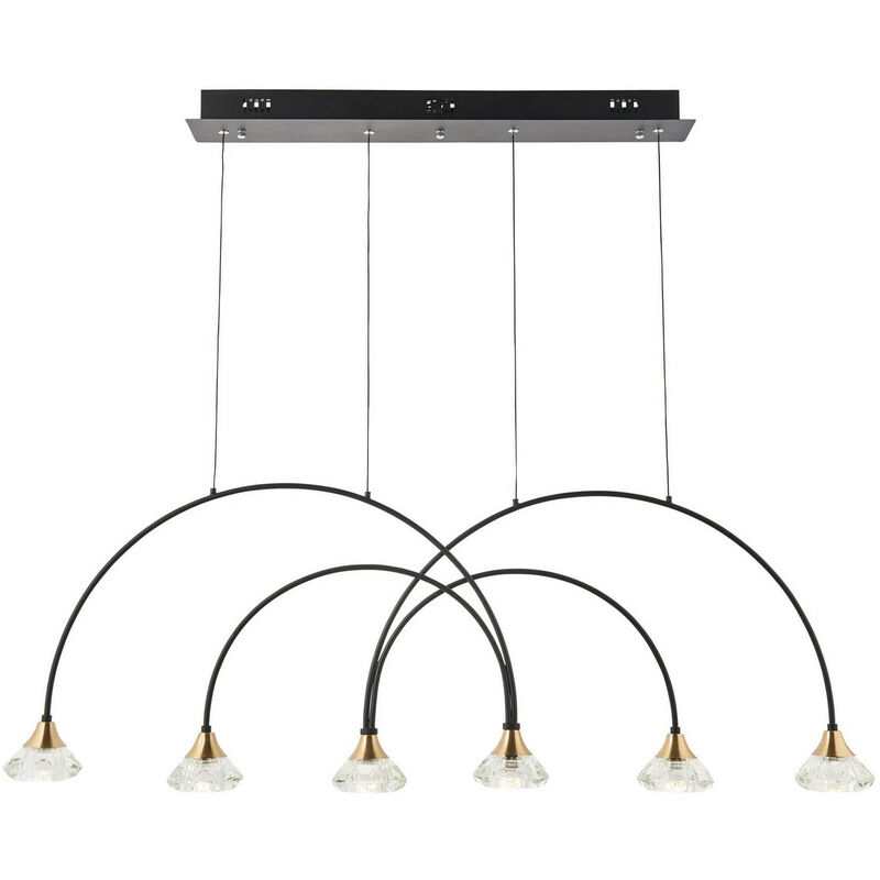 Endon Zander Lampada a sospensione da soffitto a barra a 6 luci LED integrate di colore bianco caldo, colore nero opaco | Finitura: finitura nera opaca e ottone spazzolato con cristallo trasparente | Materiale: acciaio e cristallo | Grado di protezione IP: IP20 | Altezza minima: 45 cm | Altezza massima: 150 cm | Lunghezza: 110 cm | Larghezza: 10 cm | Tipo di lampada: LED integrato | Numero di lampade: 6 | Lampadina inclusa: sì | Dimmerabile: sì | Kelvin: 3000K | Potenza (massima): 6 x 2,16 W