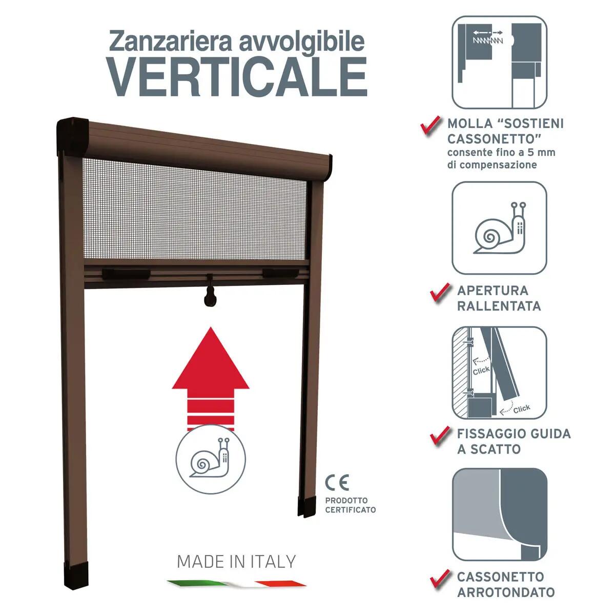 Zanzariera verticale a rullo con telaio in fibra di vetro color grigio, struttura in alluminio color marrone, adatto per finestre.. Ideale per la protezione dagli insetti. Made in Italy