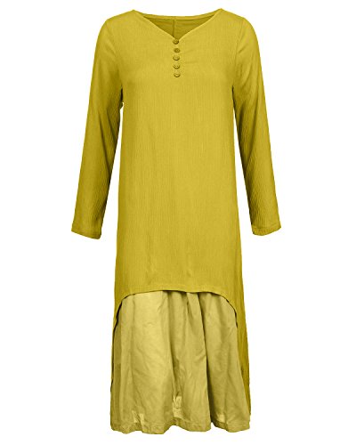 ZANZEA Donne Doppi Strati Cotone Lino Maniche Lunghe Bordo Irregolare Vestito (IT 54, Giallo)