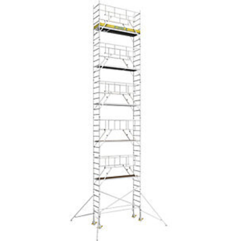Trabattello mobile S-PLUS, piattaforma 1,80 x 0,60 m, altezza di lavoro 12,35 m. Fornitura = smontato. Larghezza piattaforma = 600 mm. Altezza piattaforma = 10350 mm. Lunghezza piattaforma = 1800 mm. Altezza di lavoro = 12.35 m. Altezza trabattello = 11.6 m. Peso = 288.6 kg. Materiale = alluminio. Portata = 202 kg. Dotazione ruote = 4 rotelle pivottanti con 4 fermi. Diametro ruote = 200 mm. Larghezza trabattello = 0.75 m. Lunghezza trabattello = 1.8 m. Versione = 4 stabilizzatori. Norma = DIN EN 1004-1. Tipo di prodotto = trabattelli mobili standard. Montaggio e smontaggio sicuri grazie alle ringhiere anteriori. Compensazione millimetrica dell'altezza mediante rotelle pivottanti con freno a perno. Altezze di lavoro possibili da 3,40 m fino a 13,20 m. Questo trabattello mobile professionale garantisce un lavoro sicuro a diverse altezze. Montaggio e smontaggio rapidi e sicuri grazie a una ringhiera anteriore (al posto di ringhiere e diagonali di rinforzo) e piattaforme a intervalli di 2