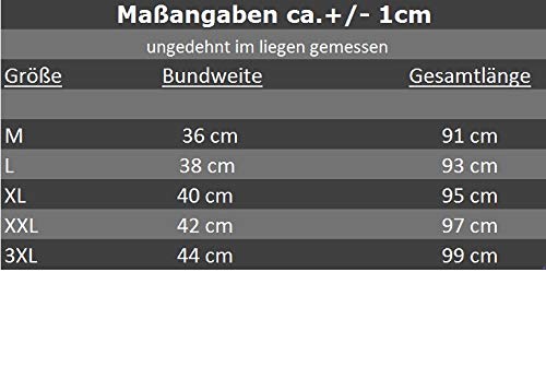 Dimensioni approssimative (+/- 1 cm), non tesi, misura da distesi: Larghezza della cintura: Taglia S = 36 cm, M = 38 cm, L = 40 cm, XL = 42 cm, XXL = 44 cm. Lunghezza totale: Taglia S = 91 cm, M = 93 cm, L = 95 cm, XL = 97 cm, XXL = 99 cm.