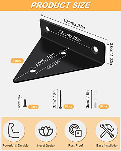 【Struttura triangolare】Staffe per Mensole a Parete Dimensioni: 100 x 80 mm/3,94 x 3,15 pollici. Materiale: acciaio. La superficie è trattata con nero, antiruggine e più sicura. La confezione include: 4 reggimensola;