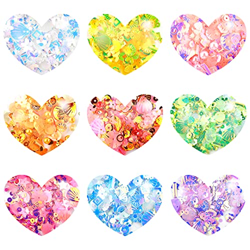 【Kit di forniture per decorazioni in resina】 9 set di materiali di riempimento di diversi colori includono perle e paillettes finte con stelle, fiori, conchiglie, cerchi e motivi irregolari. Saranno la ciliegina sulla torta per la tua arte fatta a mano