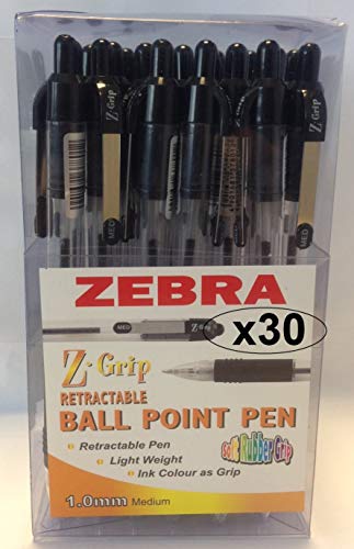 Zebra Z-Grip Retractable Ballpoint Pen, Medium, 1.0 mm, Clear Barrel, BLACK Ink 30-Count