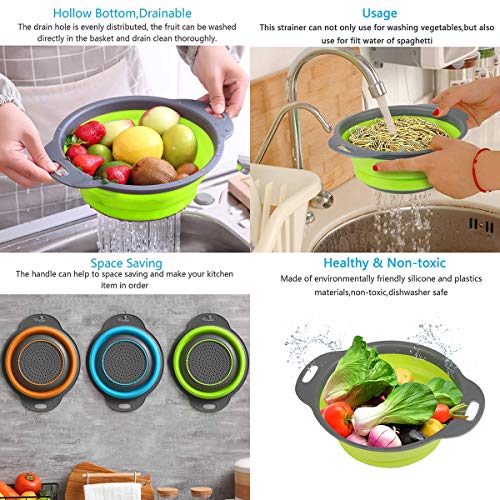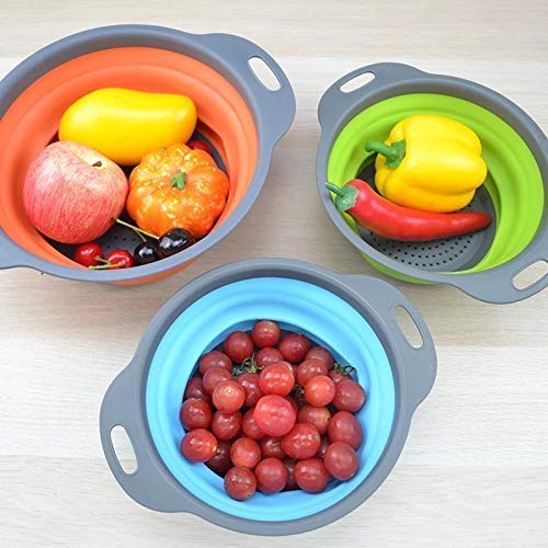 Zeeanker Set di 3 colino pieghevole da cucina, colino pieghevole, in silicone, pieghevole, colino, colino pieghevole, ideale per pasta, verdure, frutta, blu, verde, arancione