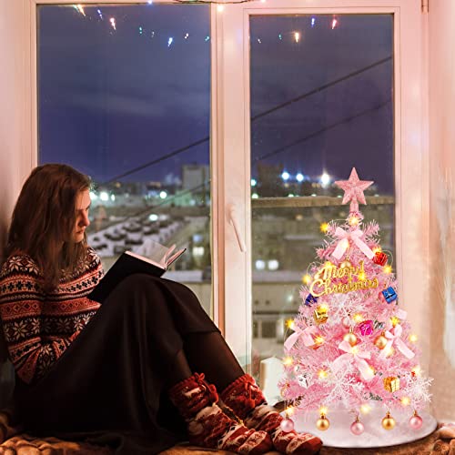 Zelaby 60CM Albero di Natale Piccolo, Mini alberi di Natale con Luci Incorporate, Albero di Natale Artificiali, con Gonne Albero di Natale Ornamenti Natalizi, per Natale Decorazioni Tavola, Rosa