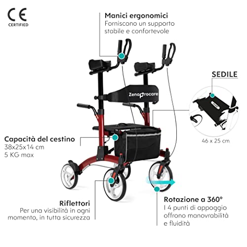 Zenaprocare - Deambulatore per Anziani 4 Ruote Pieghevole - Deambulatore Pieghevole - Con Borsa Shopping e Supporto Porta Bastone - Deambulatore per Anziani