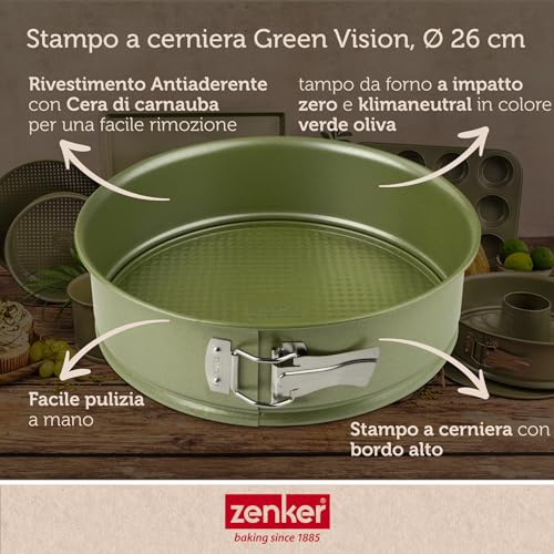 Zenker Stampo Tortiera Apribile a 1 Fondo con Cerniera Ø26 cm, in Acciaio Carbon Steel Rivestimento Antiaderente in Cera di Carnauba, Colore Verde Oliva, Linea Green Vision