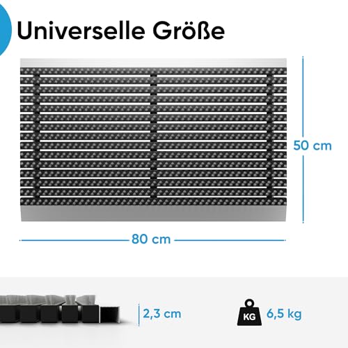 CARATTERISTICHE DEL PRODOTTO: Riceverai uno zerbino per uso esterno di alta qualità con telaio in alluminio e spazzole in nylon grigio di dimensioni 50 x 80 cm. L'altezza totale del tergi scarpe è di circa 2,3 cm. La lunghezza delle spazzole è di 0,7 cm.