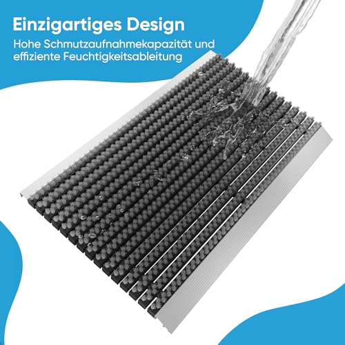 RIMUOVE UMIDO E SPORCO: il tappetino in alluminio è in grado di rimuovere rapidamente ed efficacemente lo sporco dalle suole delle tue scarpe. Grazie alle file separate di spazzole, l'umidità non si accumula sotto il tappetino. A differenza dei tipici modelli di zerbino alluminio esterno, il nostro zerbino per uso esterno si asciuga molto più velocemente ed è facile da pulire.