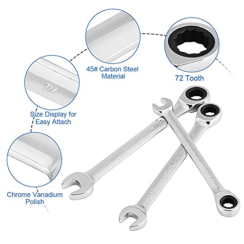 Cricchetto design, veloce e risparmio: Lucidato a specchio, la chiave a stella è lavorato da complessiva lucidatura fine, difficile da ruggine.Design anti-goccia e antiscivolo, aumentare la forza di morso e migliorare la torsione. 5 ° angolo di ritorno, 72 denti cricchetto qualità fine, ideale per accedere a aree che sono difficili da raggiungere.
