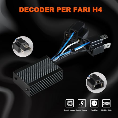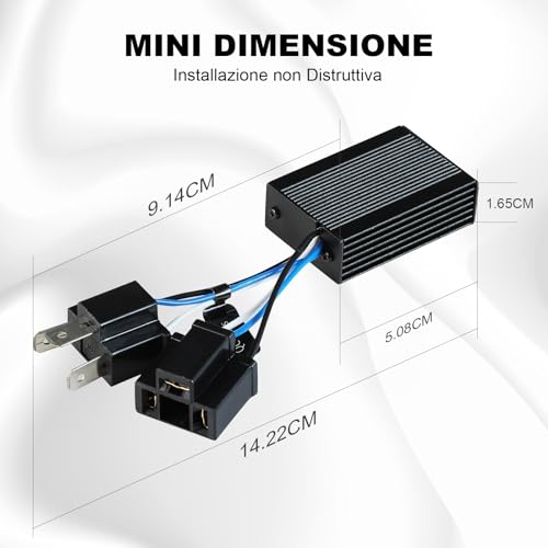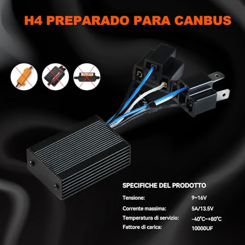 Funziona per la Lampadina H4: Tensione DC 9V-16V, Temperatura di funzionamento a -40°C~+80°C, Corrente massima a 5A/13.5V, Capacità 10000UF, Design impermeabile IP65. Questi condensatori di cancellazione degli avvisi sono progettati specificamente per la lampadina H4 LED, ampiamente compatibile con il 98% dei veicoli.