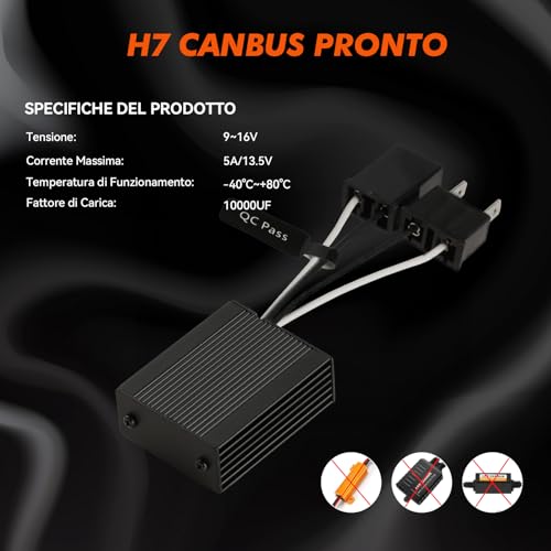 Funziona per la Lampadina H7: Tensione DC 9V-16V, Temperatura di funzionamento a -40°C~+80°C, Corrente massima a 5A/13.5V, Capacità 10000UF, Design impermeabile IP65. Questi condensatori di cancellazione degli avvisi sono progettati specificamente per la lampadina H7 LED, ampiamente compatibile con il 98% dei veicoli.