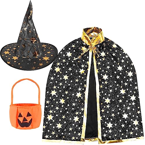 【Costume di Halloween】Il set è composto da un mantello magico per bambini, un cappello magico e un sacchetto di caramelle di zucca in feltro. Il design del motivo a stella lo rende molto carino e divertente come una classica strega o un mago.Questo mantello magico è adatto per la maggior parte dei ragazzi, ragazze, bambini.