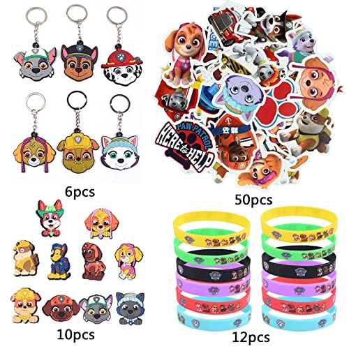 ZeYou 78 pezzi di Paw Patrol Bomboniere per bambini, decorazioni di compleanno di Paw Dog Patrol include 12 braccialetti in silicone, 50 adesivi, 10 calzascarpe e 6 portachiavi