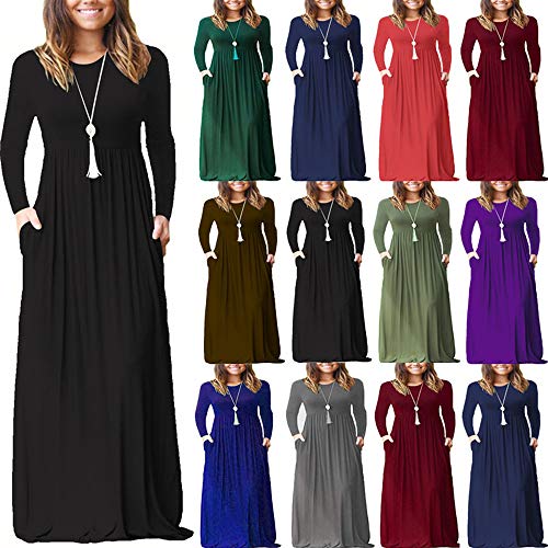 ZHANGNA Donna Manica Lunga Gonna Lunga Scollo Rotondo Casual Cocktail Maxi Abito con Tasche (Large, Rosso)