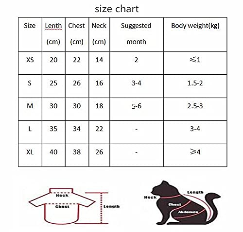 La taglia dei vestiti del gatto deve essere selezionata in base al peso dell'animale, alla misura del petto, del collo e della schiena. Confermare la taglia e l'acquisto. I vestiti del gatto sono fatti a mano. Il panno a volte sarà esaurito, se questo è il caso Ti contatteremo in tempo, si prega di prestare attenzione al controllo della posta.