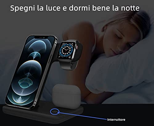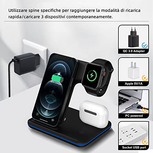 【Caricabatterie wireless 3 in 1】: il caricabatterie wireless può caricare contemporaneamente il tuo cellulare, il tuo orologio Apple e gli Airpods. Supporto per la ricarica ibrida tra Apple e Android. (Nota: è necessario utilizzare l'adattatore QC3.0 18 W quando si caricano 3 dispositivi. L'adattatore è incluso nella confezione)