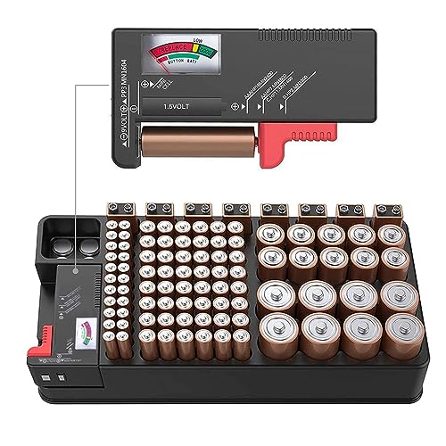 【Conservato in modo ordinato】 Ideale per batterie di diverse dimensioni, manterrà e manterrà il tuo cassetto ordinato e ordinato. Tutte le batterie possono essere fissate saldamente nella scanalatura per evitare l'attrito tra le batterie. Ti aiuta anche a trovare rapidamente il pacco batteria di cui hai bisogno, il tester della batteria si trova sul lato del vano batteria per un comodo test della batteria.