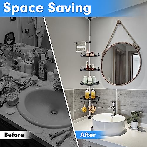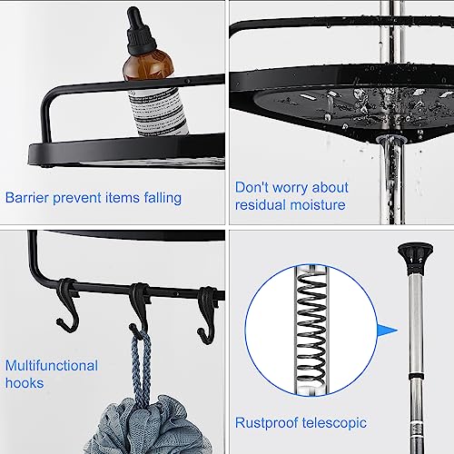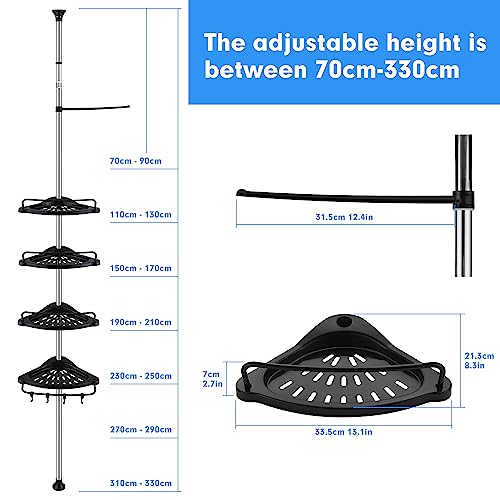ZHUGE Cestello doccia telescopico con 4 vassoi, 4 ganci e 1 asta porta asciugamani regolabile per l'organizzazione del bagno, Antiruggine, adatto per soffitti da 70 a 330 cm di altezza, nero