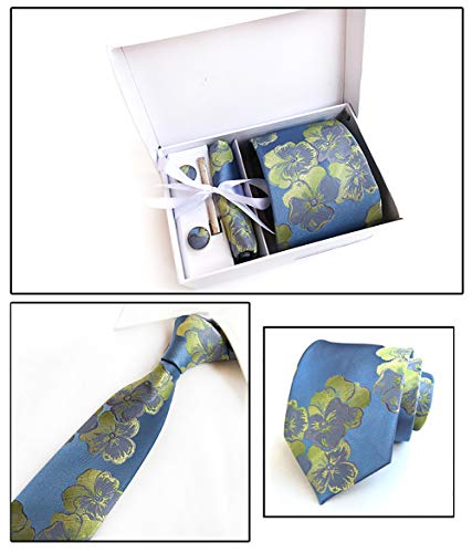 Zhxinashu 4 Pezzi Uomo Cravatte Kit - Floreale Cravatta Jacquard Fazzoletto con Gemelli Fermacravatta Abiti Casual Accessori per Papà, Marito, Fidanzato Blu